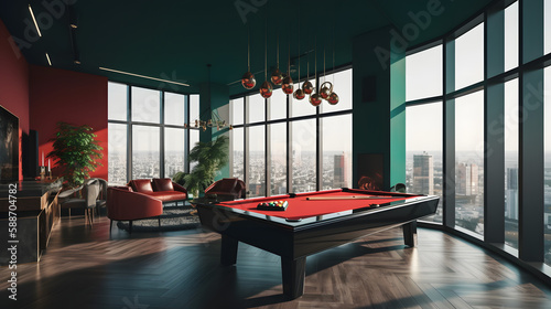 internal design with pool table in a amazing penthouse living room, 3d render, generative ai