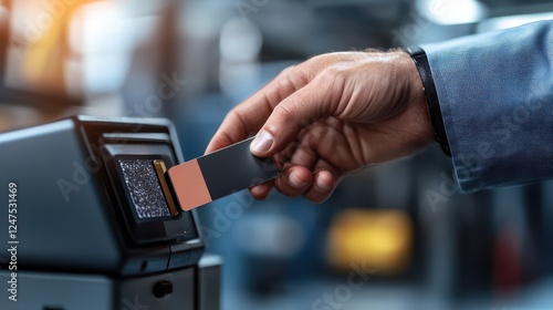Internal supply chain concept. Hand Inserting Smart Card into Reader at Public Transportation Station in Urban Environment
