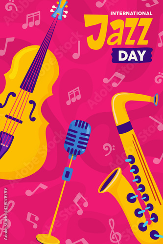 jazz, day, music, vector, greeting card, greeting, card, musical, band, saxophone, trumpet, instrument, background, illustration, april, 30, live, concert, festival, poster, club, event, microphone, colourful, play, art, sound, blues, key, cello, fun, design, cartoon, flat, sax, note, international, text, celebration, keyboard, culture, classic, classical, show, party, graphic, audio, quote