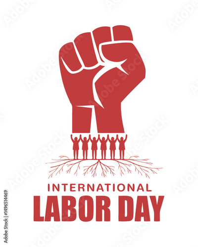 labour day, men at work, oneness, strength, solidarity, teamwork, community, fist, root, people, red, graphic design, vector, illustration, symbol, holiday, equality, empowerment, togetherness, support