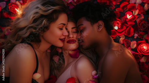 love, diversity, romance, february 14, multiracial, celebration, affection, woman, kiss, triad, human relationships, joy, happiness, intimate, inclusive, rose petal, party, threesome, bonding, companionship, smile, togetherness, friendship, festive, young adult, stylish, man, trio, bisexual, gay, homosexual, lesbian, white, black, african american, caucasian, interracial