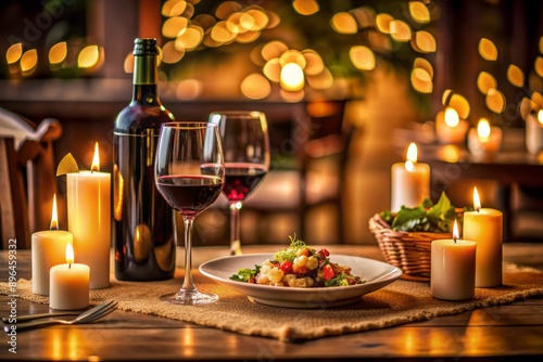 Intimate candlelit dinner setting in a cozy restaurant with a bottle of wine and a delicious meal, evoking romance and togetherness.
