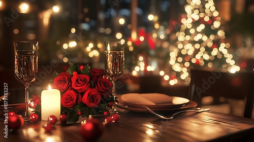 Intimate Christmas dinner setup, table for two with candles, red roses, and holiday decorations, soft shadows and warm lighting, a glowing Christmas tree visible in the background,