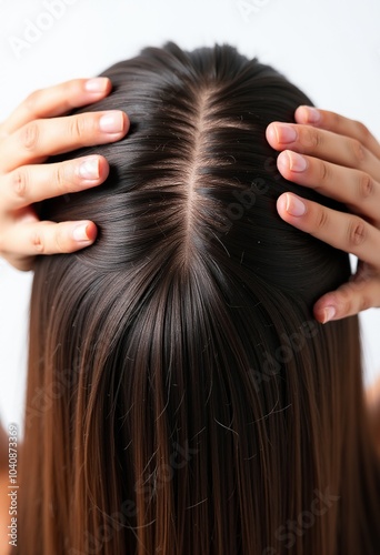 Intimate Close-Up of Dark Brown Hair: A Detailed Exploration of Scalp, Hair Parting, and Roots for Hair Care Enthusiasts