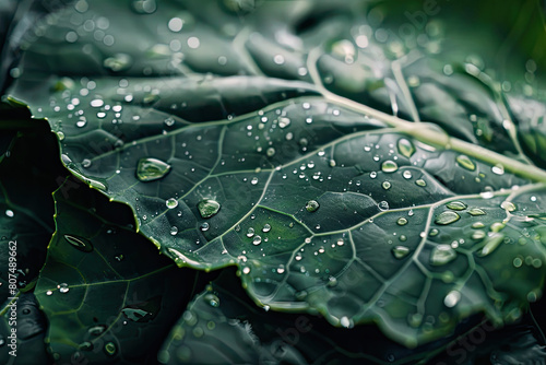 Intimate macro of collard greens, the leaves' dark green surface speckled with fresh dewdrops, capturing the essence of early morning freshness.
