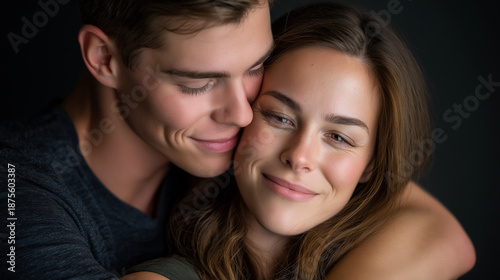 Intimate portrait young couple display, expressing love connection warm studio setting, relationship visualization, romantic photography concept, emotional bond representation, wit