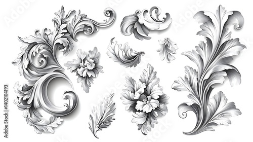 Intricate Baroque Floral Patterns, Intricate black and white baroque floral patterns on a white background