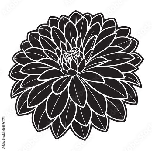 dahlia, flower, illustration, black-and-white, monochrome, floral, botanical, detailed, outline, graphic, design, art, nature, plant, bloom, garden, decorative, vector, drawing, line art, silhouette, contrast, elegant, simple, clean, modern, stylised, abstract, pattern, texture, isolated, white background, dark, light, symmetry, center, layer, organic, beauty, vintage, retro, tattoo, sticker