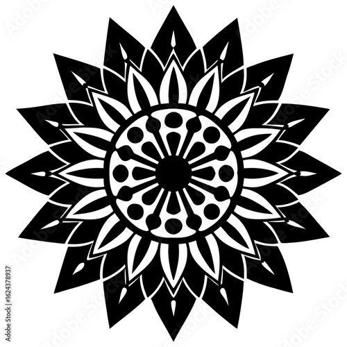 flower, pattern, design, geometric, abstract, symmetry, ornament, decoration, art, black, graphic, element, symbol, mandala, star, shape, center, leaf, detail, modern, simple, clean, bold, contrast, creative, unique, beautiful, elegant, stylised, radiant, radial, circular, zen, meditation, spiritual, cultural, traditional, ethnic, folk, artistic
