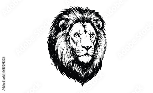 Intricate black and white lion portrait with detailed mane. Vector retro hand drawn illustration