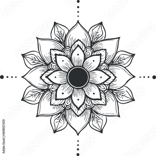 Intricate black and white mandala flower design with symmetrical petals and decorative elements Black on transparent background.