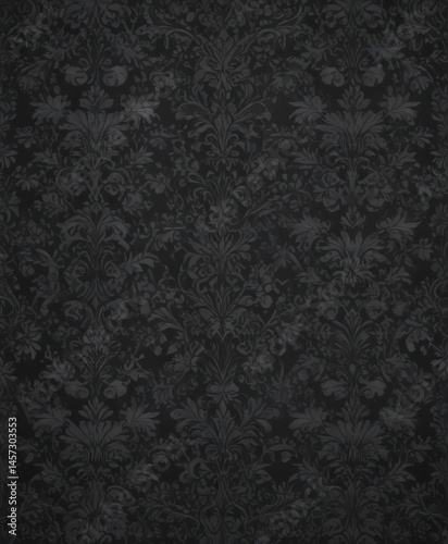 Intricate black damask floral pattern on dark gray , vintage, texture, black