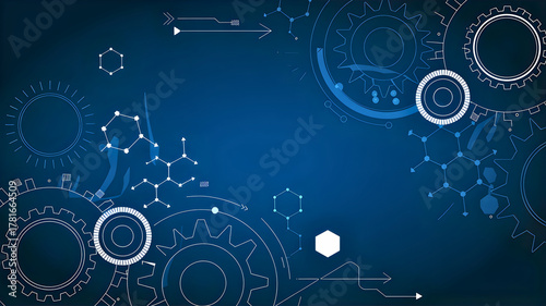 Intricate blue abstract background with gears, molecules, and technological elements