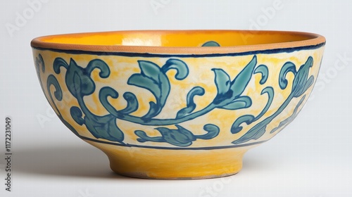 Intricate Blue Floral Ceramic Bowl on Yellow Background