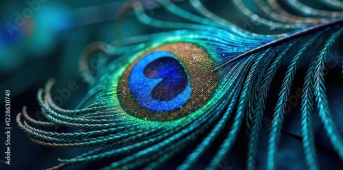 Intricate blue peacock feather details, iridescent sheen, shimmer, beauty, luxury