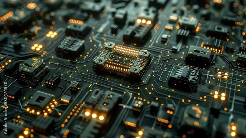 Intricate close-up of a circuit board showcasing vibrant electronic components and glowing lights, symbolizing technology and innovation.
