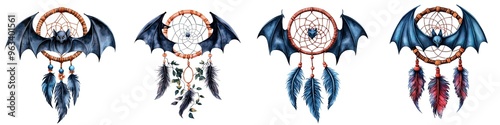 Intricate collection of dreamcatchers featuring bat motifs and colorful feathers for mystical and artistic vibes.