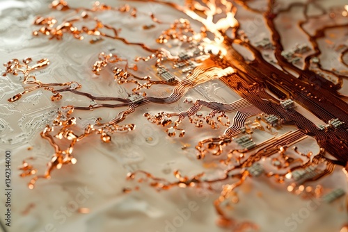 Intricate copper circuitry resembling a tree-like network on a circuit board.