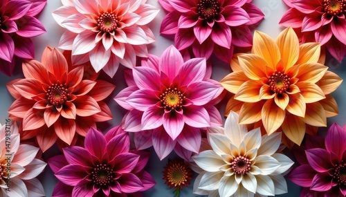 Intricate dahlia blooms in vibrant hues form a repeating floral pattern , orange, bloom
