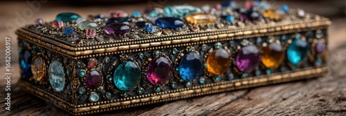 Intricate decorative box adorned with colorful gemstones resting on a rustic wooden surface