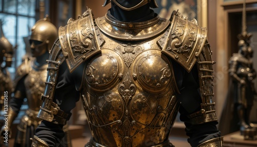 armoring, knight, mediaeval, gold, ornate, historical, museum, exhibition, craftsmanship, metalwork, protection, design, culture, tradition, display, exhibit, costume, warrior, battle, artistry, heritage, era, decoration, technology, silhouette, collection, antique, regal, impressive, sculpture, attire, vintage, unique, statuary, metallic, pattern, detail, background, showpiece, inspiration, elegance