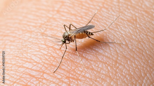 Intricate Encounter of Aedes Aegypti on Skin, highlighting detailed anatomy and feeding signs, with a blurred background for focus.