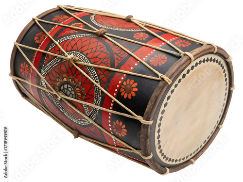 Intricate ethnic dholak drum featuring vibrant red floral motifs, perfect for cultural music events,isolated on white background