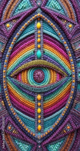 Intricate eye design created with colorful woven threads and beads.