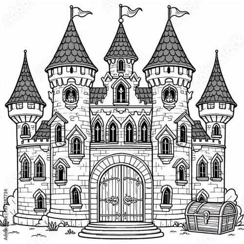 castle, fairy tale, children, architecture, fantasy, mediaeval, tower, whimsical, art, illustration, black-and-white, printable, vector, line art, royal palace, detailed, fairy tale, draw, book, enchanting, fortress, magical, royals, heritage, creative, education, majestic, decoration, storytelling, hand-drawn, outline