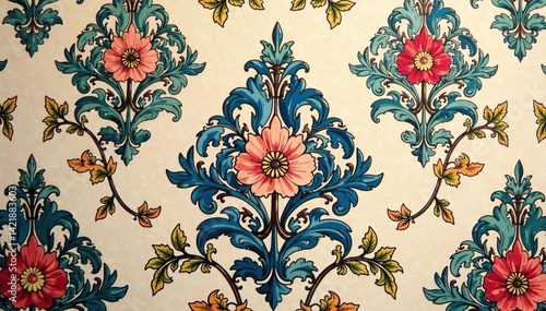 Intricate floral damask pattern in muted tones, graphics, design element, seamless