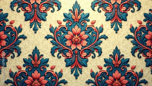 Intricate floral damask pattern in muted tones, photography, art, graphics