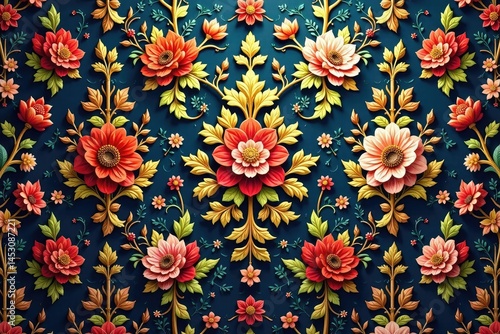 Intricate floral damask textile design, ornate repeating details, style, arabesque, botanical