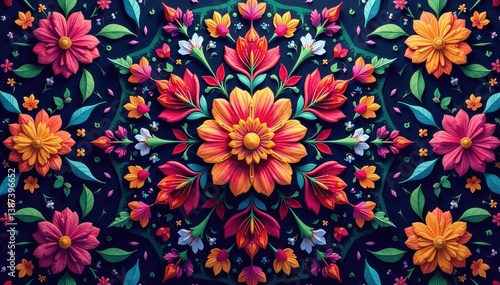 Intricate floral pattern within a hexagon, vibrant hues, bloom, modern