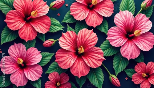 Intricate hibiscus blossoms, vibrant hues, repeating floral motif , design, illustration, Hibiscus