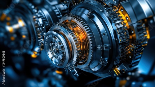 gear, machine, mechanism, technology, engineering, metal, industrial, component, part, hardware, precision, robotic, automotive, manufacturing, industry, system, design, innovation, invention, craftsmanship, blue, steel, chrome, orange, gold, dark, texture, closeup, detail, complex, intricate, powerful, strength, energy, motion, power, efficiency, craftsmanship, aesthetic, futuristic