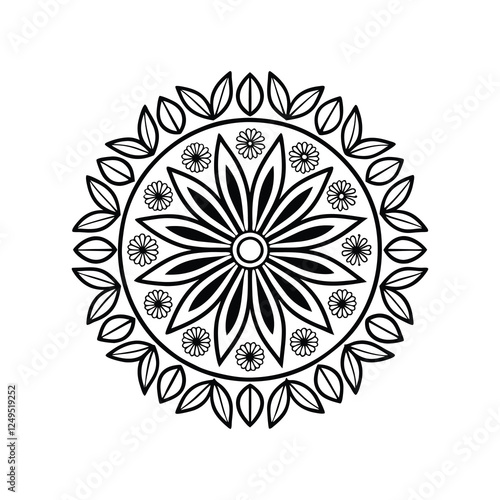 mandala, floral, flower, leaf, design, pattern, circle, symmetry, illustration, black-and-white, intricate, geometric, decorative, design element, vector, digital artwork, graphic design, background, ethnic, indian, bohemian, zen, meditation, spirituality, poster, wallpaper, invitation, printable, template, abstract art, line art, background image, floral pattern, floral pattern
