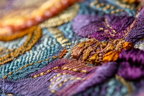 Intricate multicolored embroidery, textured threads, close-up view.