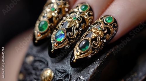 nail, art, gemstone, fashion, beauty, manicure, design, luxury, creativity, elegance, style, decoration, black, gold, opal, emerald, shiny, detailed, ornate, accessory, salon, aesthetic, trend, colours, polished, chic, craftsmanship, closeup, inspiration, glamourous, high-end, unique, artistic, high-coloured, texture, statement, vibrant, stylish, modern, luxurious, detail, intricate