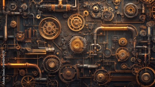 Intricate network of vintage gears and pipes, showcasing the beauty of mechanical design in a steampunk style, perfect for industrial themes.