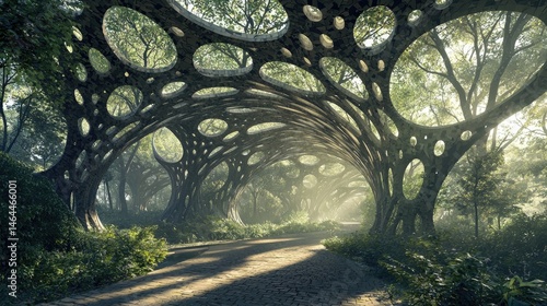 forest, path, tree, arch, structure, sunlight, nature, tunnel, organic, design, concrete, architecture, landscape, daylight, exterior, shadow, sunbeam, vegetation, environment, morning, light, grey, dark, green, leaf, foliage, open, vista, stone, rock, pattern, hole, texture, smooth, rough, natural, passage, calm, serene, way, walk, road, alley, timberland, pathway, perspective