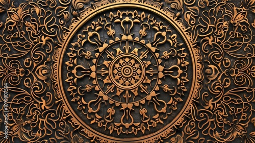 Intricate, ornate, and detailed golden pattern carved into a dark surface. Perfect for traditional, ornate, and decorative projects.
