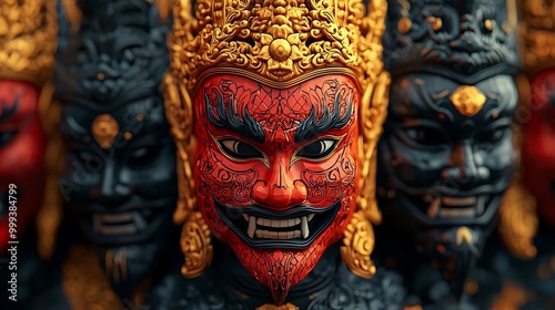 Intricate painted masks, portraying fierce deities, adorned with rich colors and elaborate details, showcasing cultural artistry.