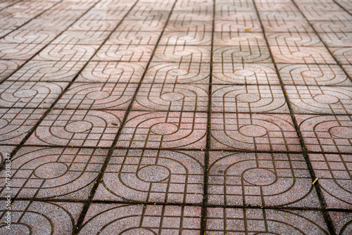 Intricate patterned pavement with curves and lines creating visual interest.