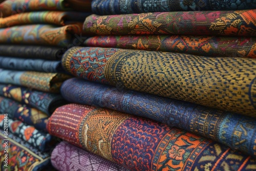 Intricate patterns woven into fabrics, combining modern and traditional styles with abstract textile design.
