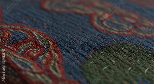 textile, fabric, closeup, detail, stitching, texture, pattern, paisley, blue, red, green, cream, brown, thread, craftsmanship, hand-made, artisan, art, garment, woven, intricate, colourful, many-coloured, depth of field, shadow, light, surface, quality, precise, subtile, variation, colours, beauty, modern, timeless, needlecraft, embroidery, quilting, patchwork