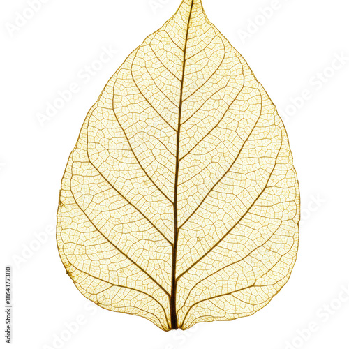 Intricate, translucent golden skeleton leaf with delicate veins and prominent midrib, on transparent with ample copy space, concept of nature's microscopic artistry