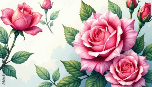 Intricate watercolor roses, lush leaves, blooming buds, summer, pattern