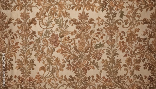 Intricate woven damask design featuring curved vines and leaves in muted earth tones, home decor , leafy, woven