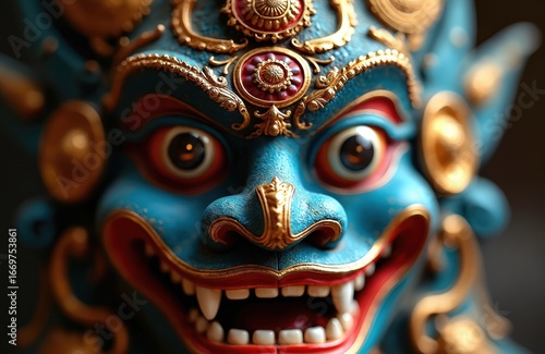 Intricately detailed Balinese Barong mask, vibrant blue, gold. Traditional Indonesian art form displays Hindu religious symbolism. Intricate gold detailing on expressive face with sharp teeth, wide