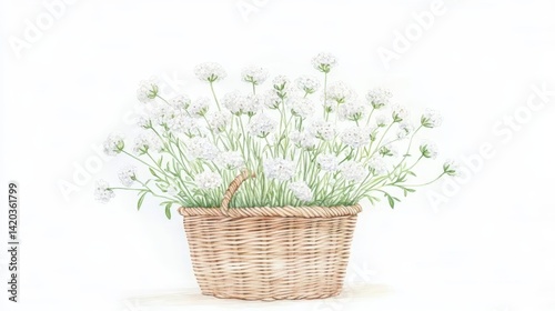 Intricately detailed watercolor floral illustration of gentle gypsophilia flowers in a rustic wicker basket with nuanced shading